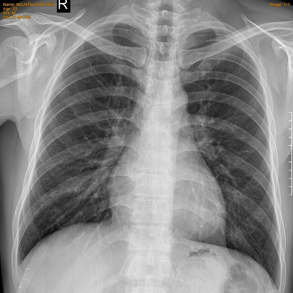 Hình ảnh X quang tim phổi hiện tại không thấy bất thường.