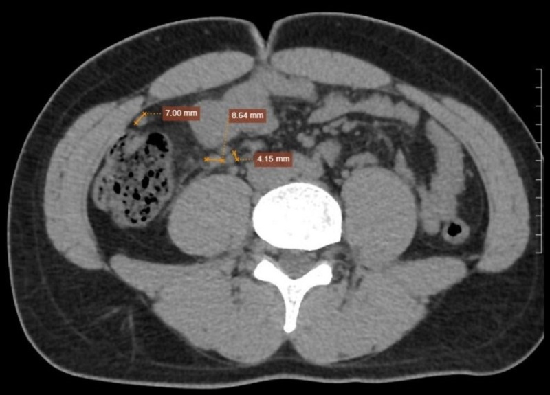 Trước sự không tương xứng giữa lâm sàng và siêu âm, bệnh nhân được chỉ định chụp CT Scanner ổ bụng. Kết quả ghi nhận ruột thừa vị trí góc manh tràng, đường kính gốc 7.7mm, thân 8.1mm, ngọn 7.2mm (đoạn ngọn quay ngược lại phía gốc ruột thừa tạo thành hình tròn), trong lòng chứa dịch, thành còn liên tục, ngấm thuốc sau tiêm. Hồi tràng thành dày nhẹ, thâm nhiễm mỡ xung quanh. Mạc treo lân cận có vài hạch, đường kính ngang lớn nhất 8.6mm. Từ đó, chẩn đoán xác định viêm ruột thừa cấp được đưa ra và bệnh nhân được chỉ định phẫu thuật kịp thời.