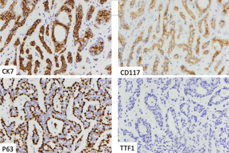Kết quả hóa mô miễn dịch cho thấy u gồm hai thành phần: tế bào biểu mô lòng ống dương tính với CK7 và CD117, trong khi tế bào cơ biểu mô dương tính với p63, đồng thời mô u âm tính với TTF1.