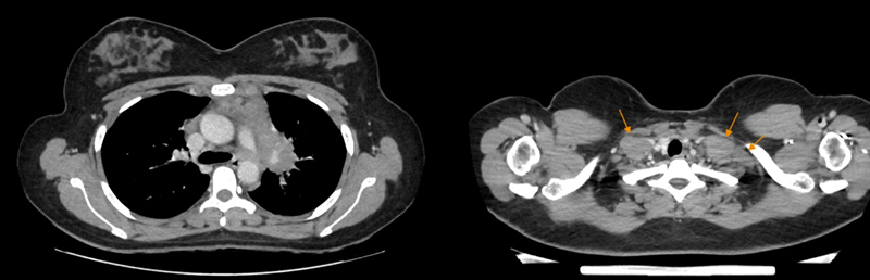 Chụp CT toàn thân có tiêm cản quang phát hiện nhiều hạch bất thường vùng nền cổ, hố thượng đòn hai bên và trung thất, các hạch tạo thành đám ôm quanh các mạch máu trong trung thất và ôm quanh phế quản gốc hai bên.
