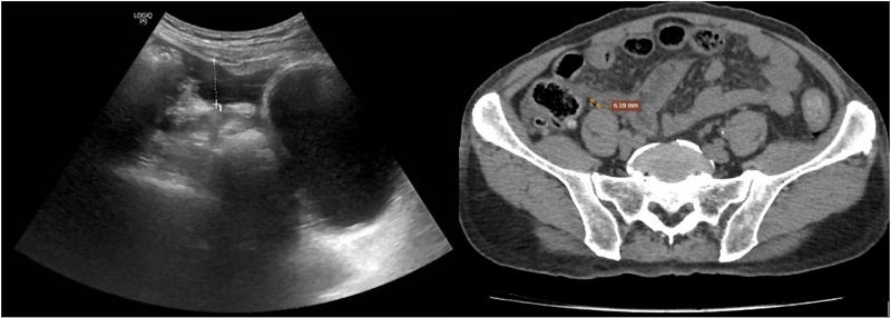 Kết quả siêu âm (bên trái) và chụp CT (bên phải) đều cho hình ảnh nghi ngờ thủng tạng rỗng