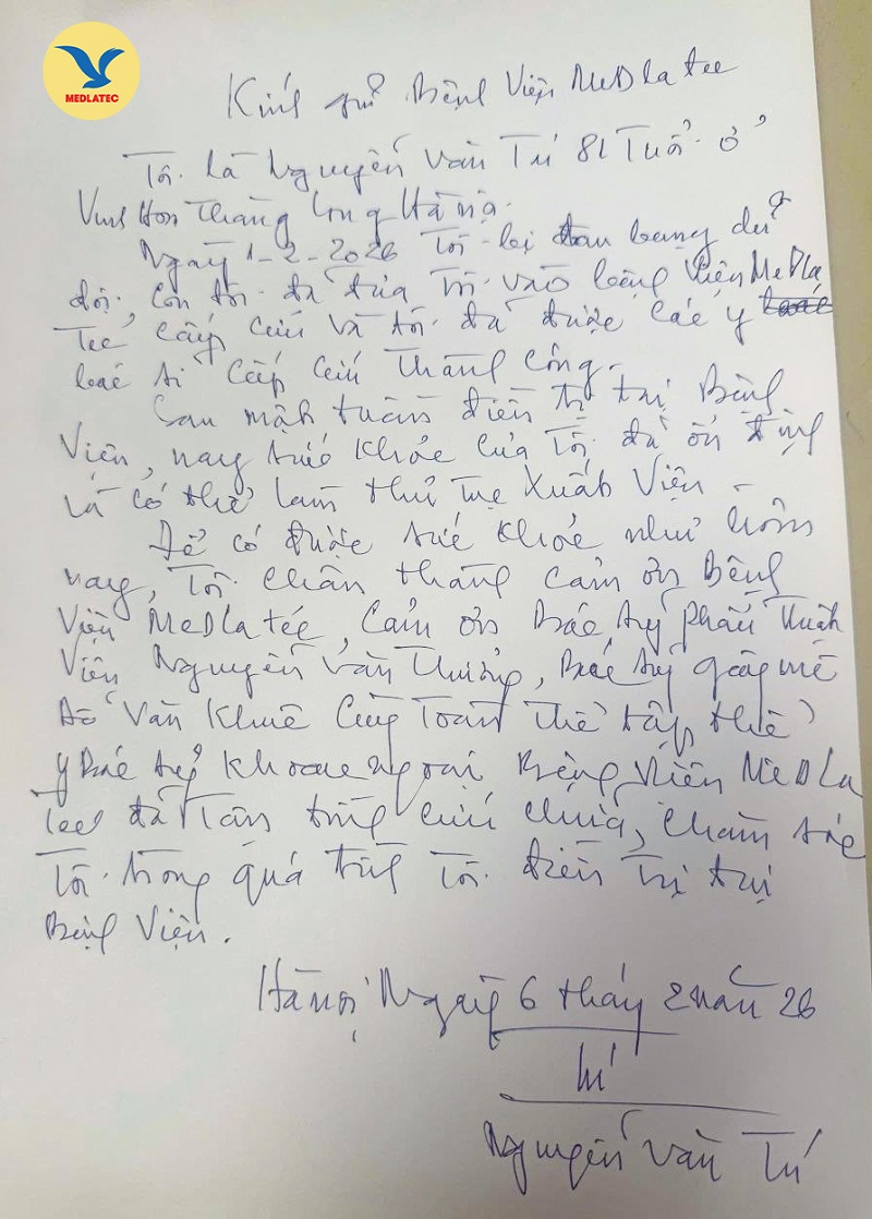 “Ngày 1/2/2026, tôi bị đau bụng dữ dội, con tôi đã đưa tôi vào Bệnh viện MEDLATEC cấp cứu. Và tôi đã được các y bác sĩ cấp cứu thành công. Để có được sức khỏe như hôm nay, tôi chân thành cảm ơn Bệnh viện MEDLATEC, cảm ơn bác sĩ phẫu thuật Nguyễn Văn Thưởng, bác sĩ gây mê Đỗ Văn Khuê cùng toàn thể tập thể y bác sĩ khoa ngoại, Bệnh viện MEDLATEC đã tận tình cứu chữa, chăm sóc tôi trong quá trình tôi điều trị tại bệnh viện", cụ Tú chia sẻ.