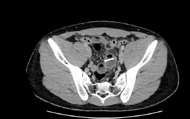Dù siêu âm và X-quang ban đầu chưa phát hiện bất thường, nhưng kết quả chụp cắt lớp vi tính (CT-scanner) thấy dị vật cản quang đoạn ruột hồi tràng (đoạn cuối của ruột non) vùng tiểu khung đâm xuyên qua lớp cơ và thanh mạc (lớp ngoài cùng), thâm nhiễm xung quanh.