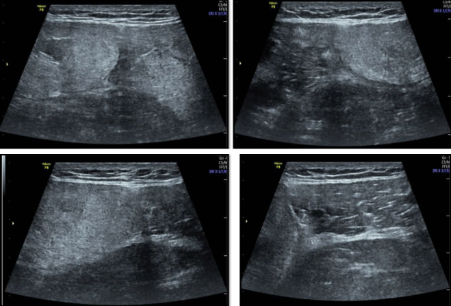 Kết quả siêu âm cho thấy hình ảnh vùng giảm âm trong tổ chức cơ tứ đầu đùi phải và trái