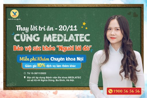 Nằm trong chuỗi hoạt động kỷ niệm Ngày Nhà giáo Việt Nam 20/11, Bệnh viện Đa khoa MEDLATEC dành tặng các Thầy/Cô giáo món quà sức khỏe ý nghĩa: Miễn phí khám các chuyên khoa Nội và giảm 10% chi phí dịch vụ làm thêm. Chương trình tri ân áp dụng từ ngày 15-31/11/2022. Kính chúc Quý Thầy/ Cô sức khỏ...