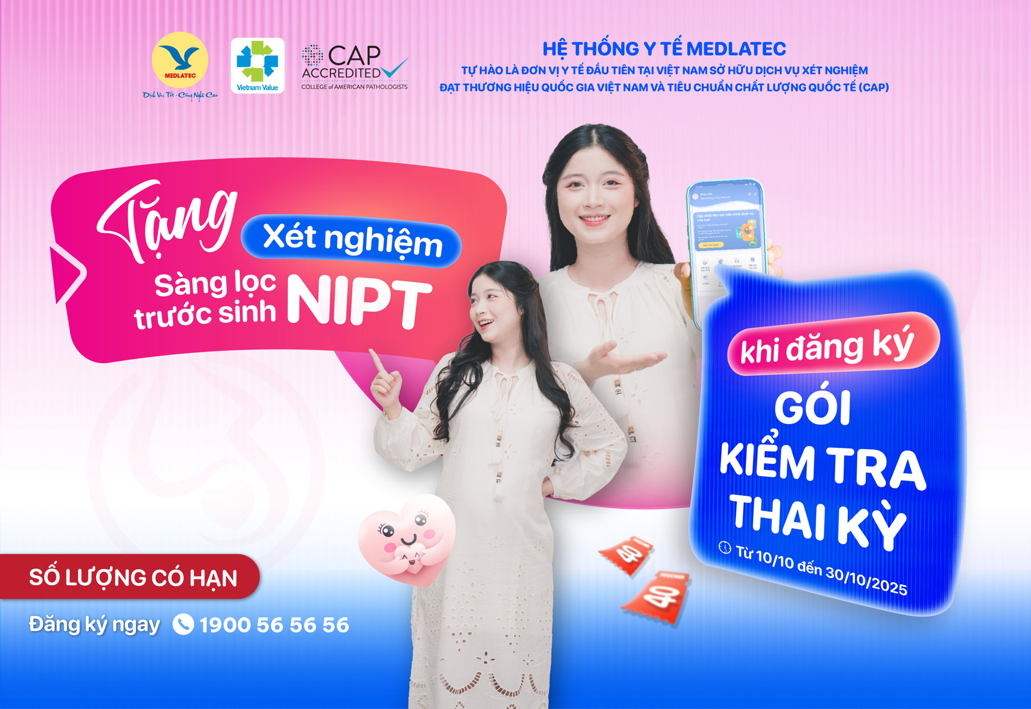 Nhân Ngày Phụ nữ Việt Nam 20/10, MEDLATEC tặng xét nghiệm NIPT 3 cho mẹ bầu khi đăng ký gói kiểm tra sức khỏe thai kỳ. Đây là lời tri ân mà MEDLATEC gửi tới những người phụ nữ đang mang thiên chức thiêng liêng, đồng thời cũng là cách đơn vị đồng hành cùng mẹ trong hành trình bảo vệ con yêu ngay t...