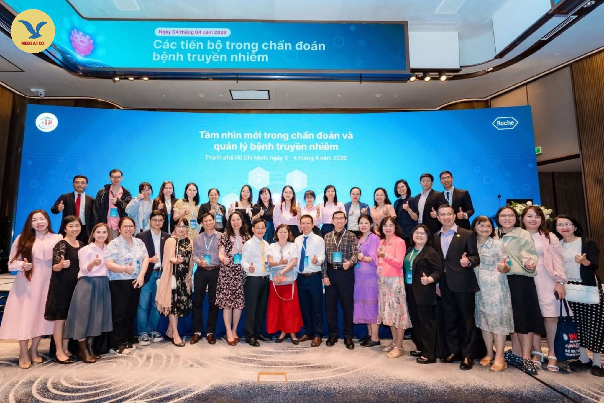 Các chuyên gia đầu ngành lĩnh vực xét nghiệm, quản lý bệnh truyền nhiễm ở các đơn vị y tế trong và ngoài nước chụp ảnh lưu niệm tại Hội nghị khoa học với chủ đề “Tầm nhìn mới trong chẩn đoán và quản lý bệnh truyền nhiễm”